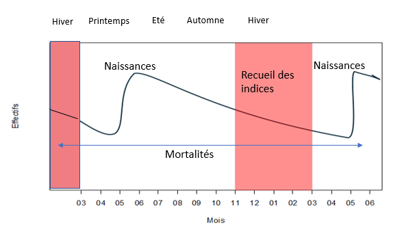 Au cours de l’année, les effectifs de la population vont varier notamment avec les naissances en mai-juin et donc une forte augmentation sur une courte période, mais également les arrivées d’individus d’autres territoires (immigration), les départs vers d’autres territoires (dispersion) et les mortalités naturelles et anthropiques qui vont s’échelonner sur toute l’année.