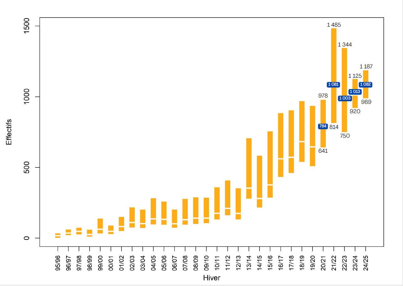 Même si l’estimation moyenne est passée de 1013 pour l’hiver 2023/24 à 1082 pour l’hiver 2024/25, cela ne constitue pas une augmentation de la population car ce n’est pas significatif du point de vue statistique.